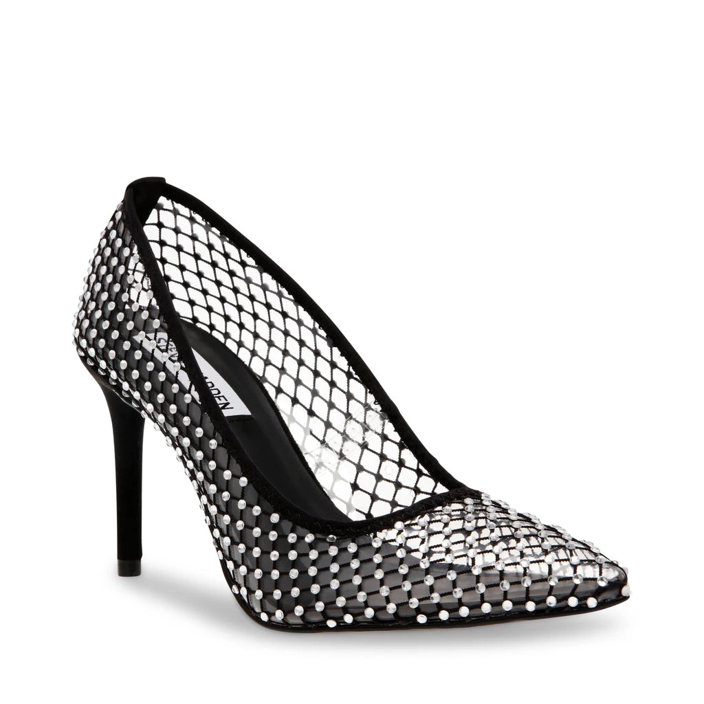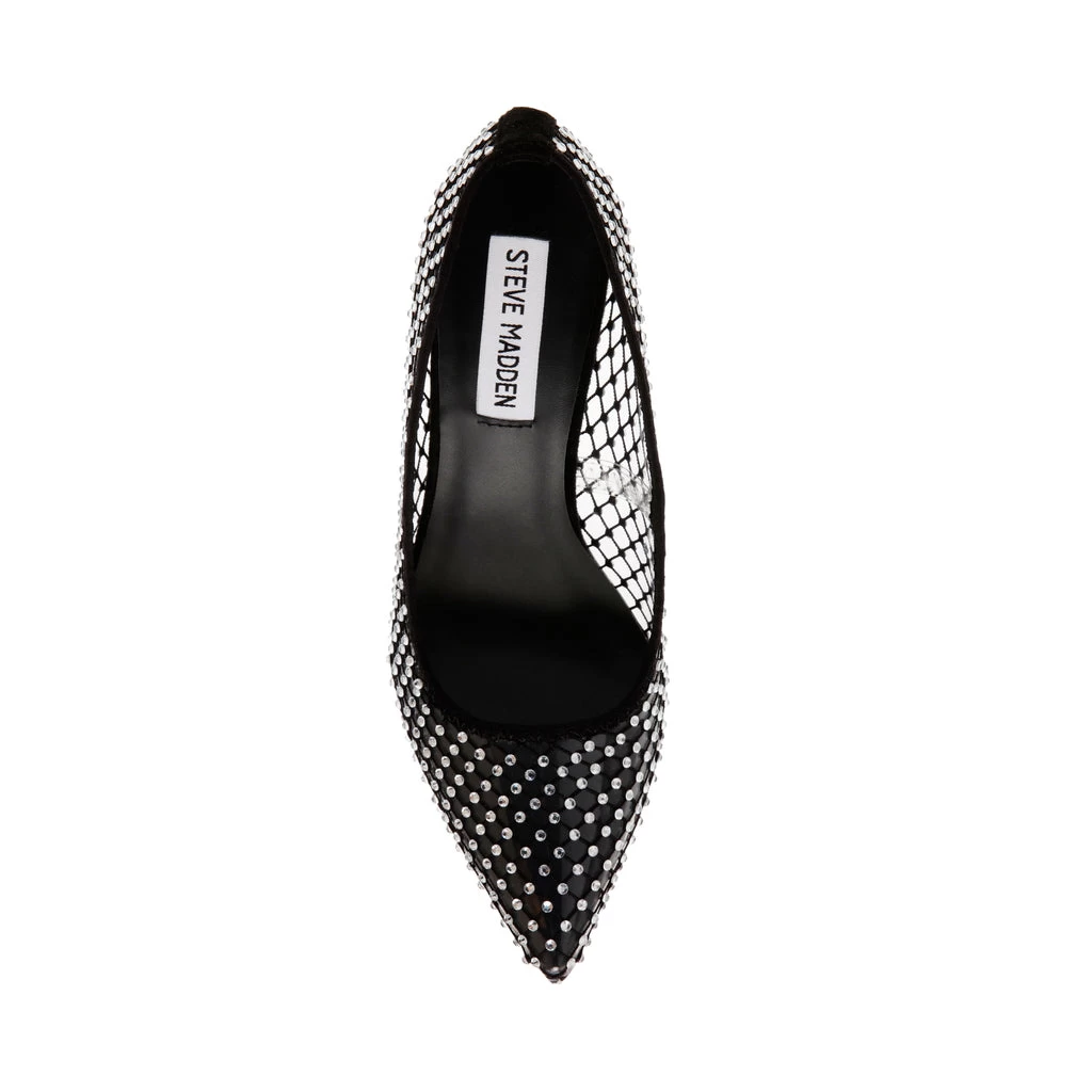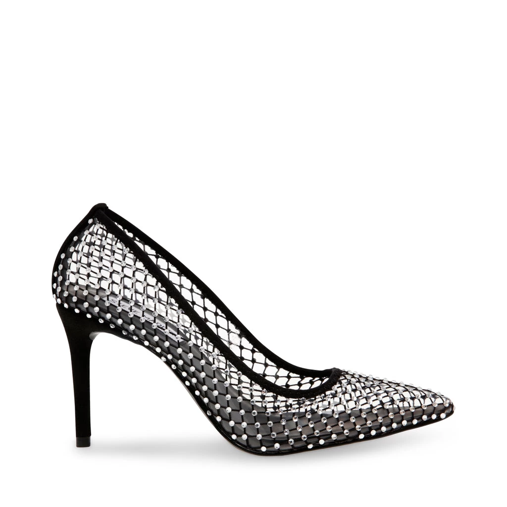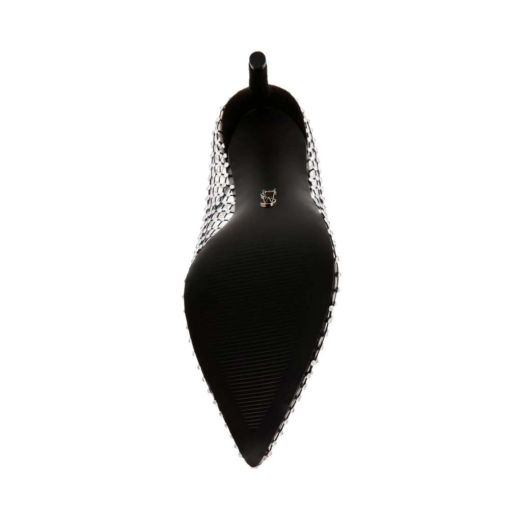 With its pointed toe and semi-low heel, the RECOURSE is giving us nostalgia for a glamorous time. This semi see-through basic pump has a comfortable stiletto heel and a rhinestone covered upper.